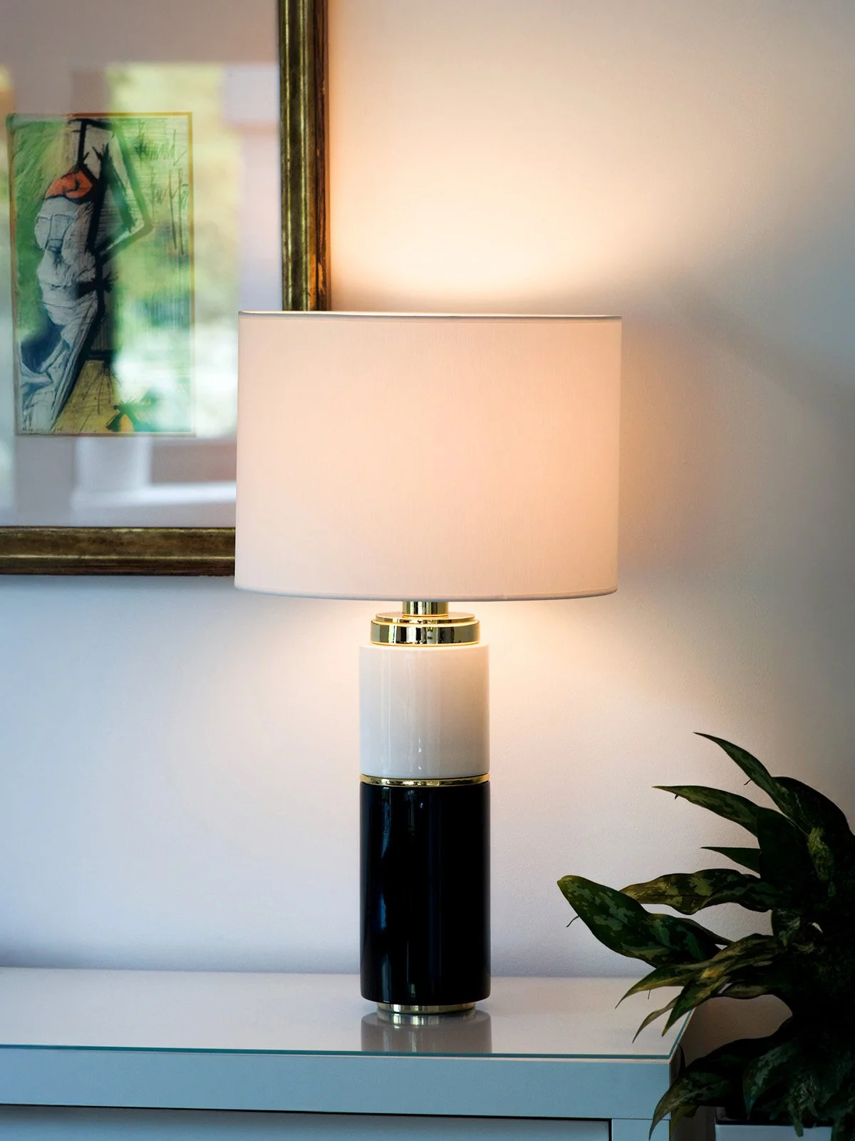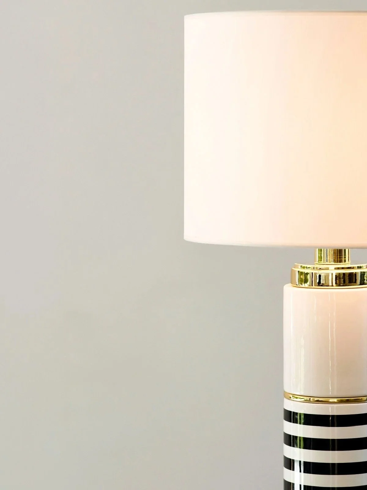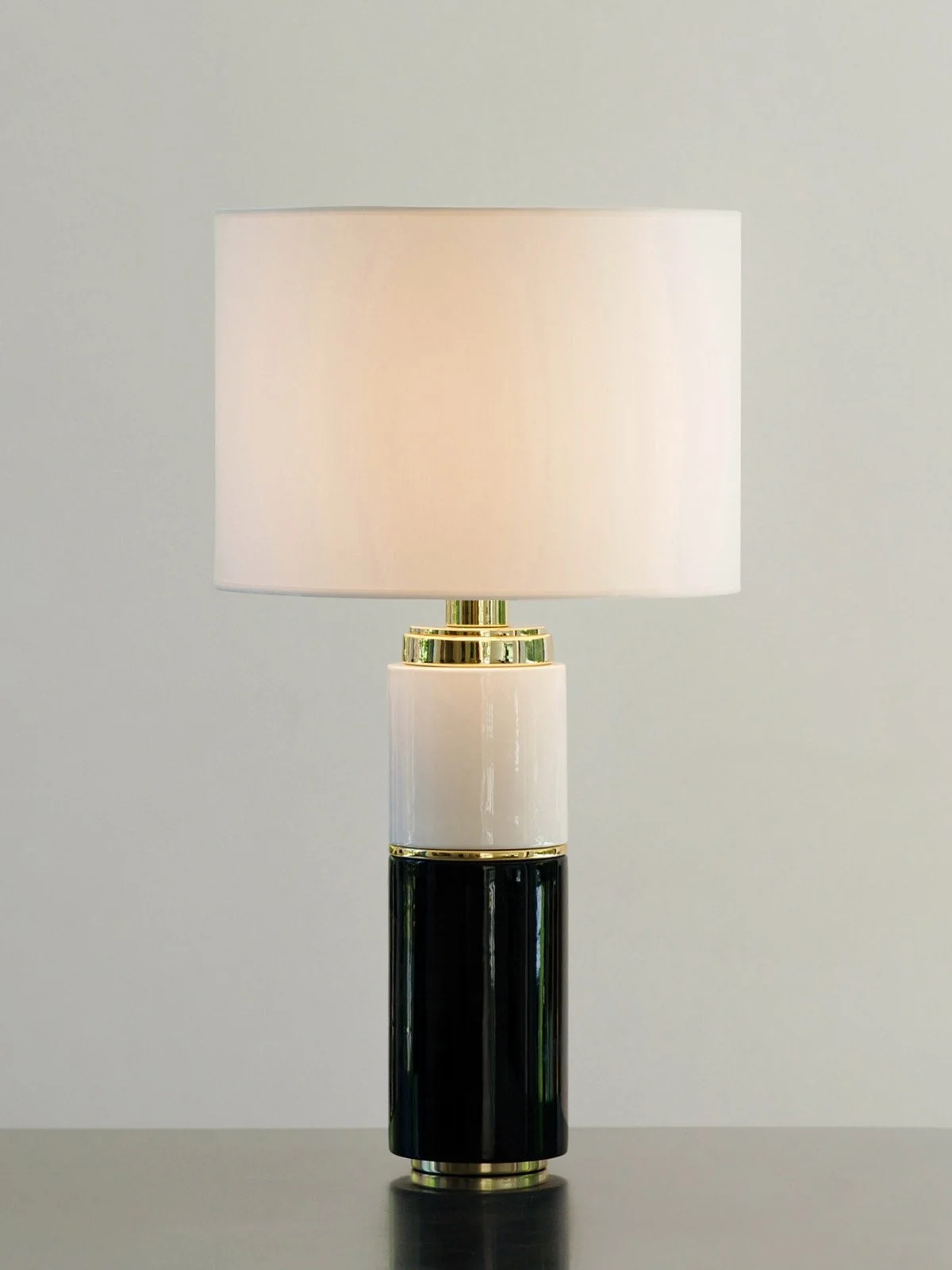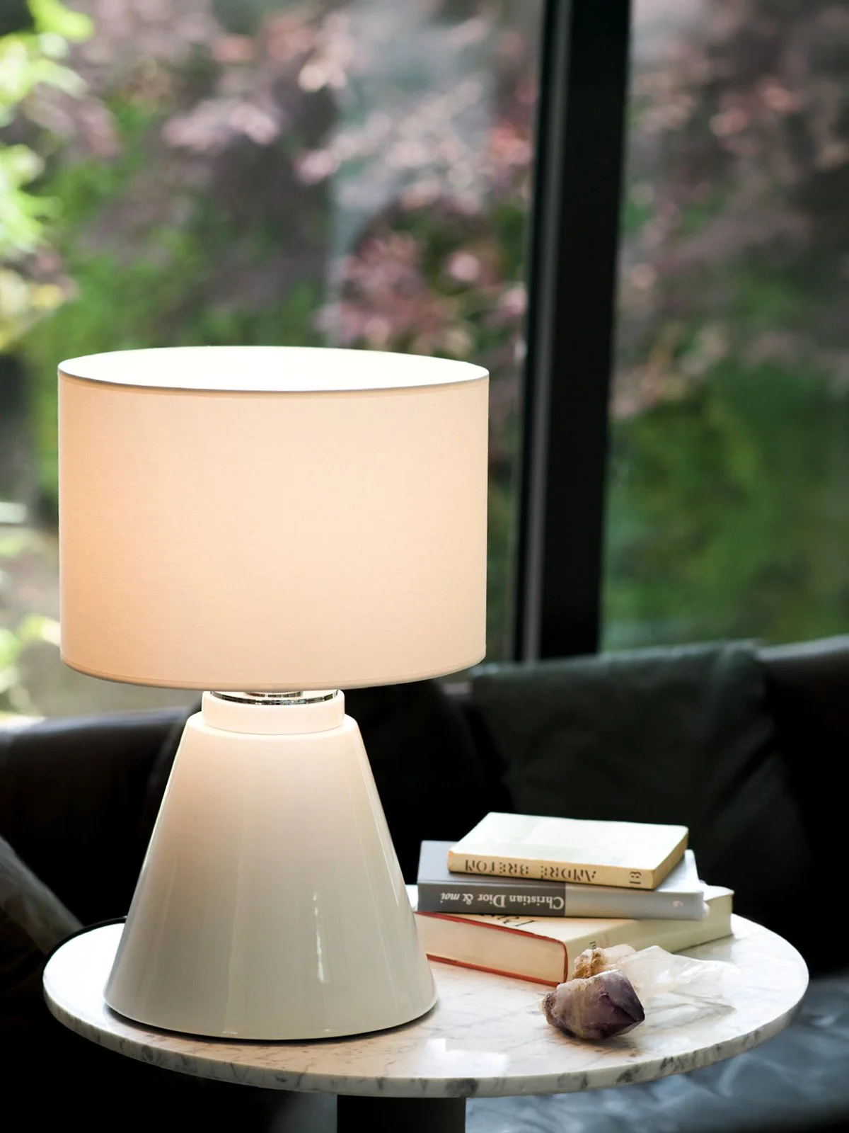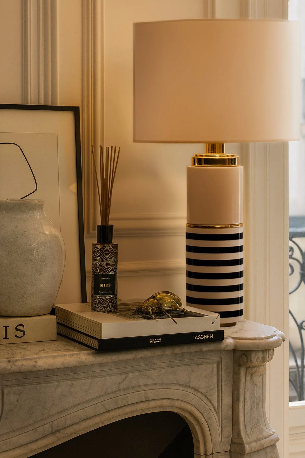 Les éléments en céramique sont assemblés par emboîtement, puis maintenus avec précision à l’aide d’un tube filetée traversant la lampe en son centre. Ce mode de construction assure une parfaite stabilité et met en valeur l’aspect modulaire de la pièce.Le haut du pied est rehaussé d’un col et d’un cache-douille en métal doré, qui diffusent une lumière chaude et raffinée une fois la lampe allumée.