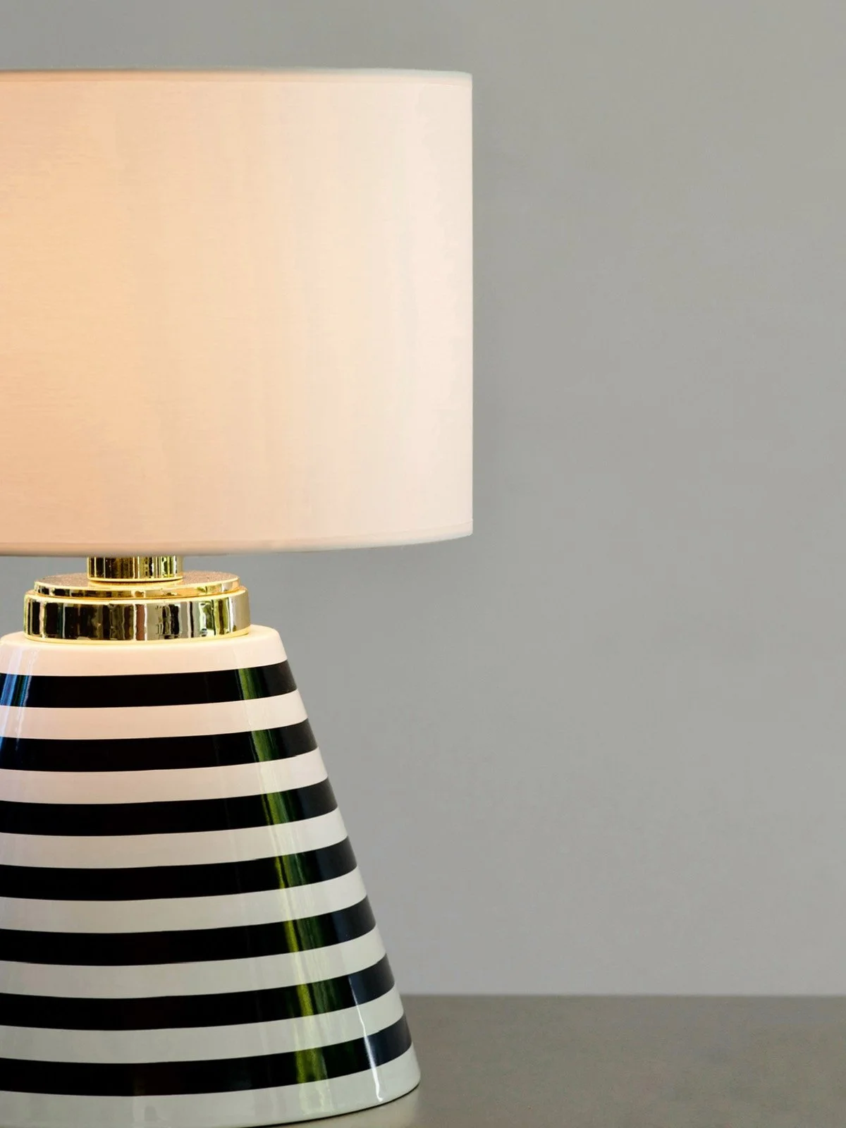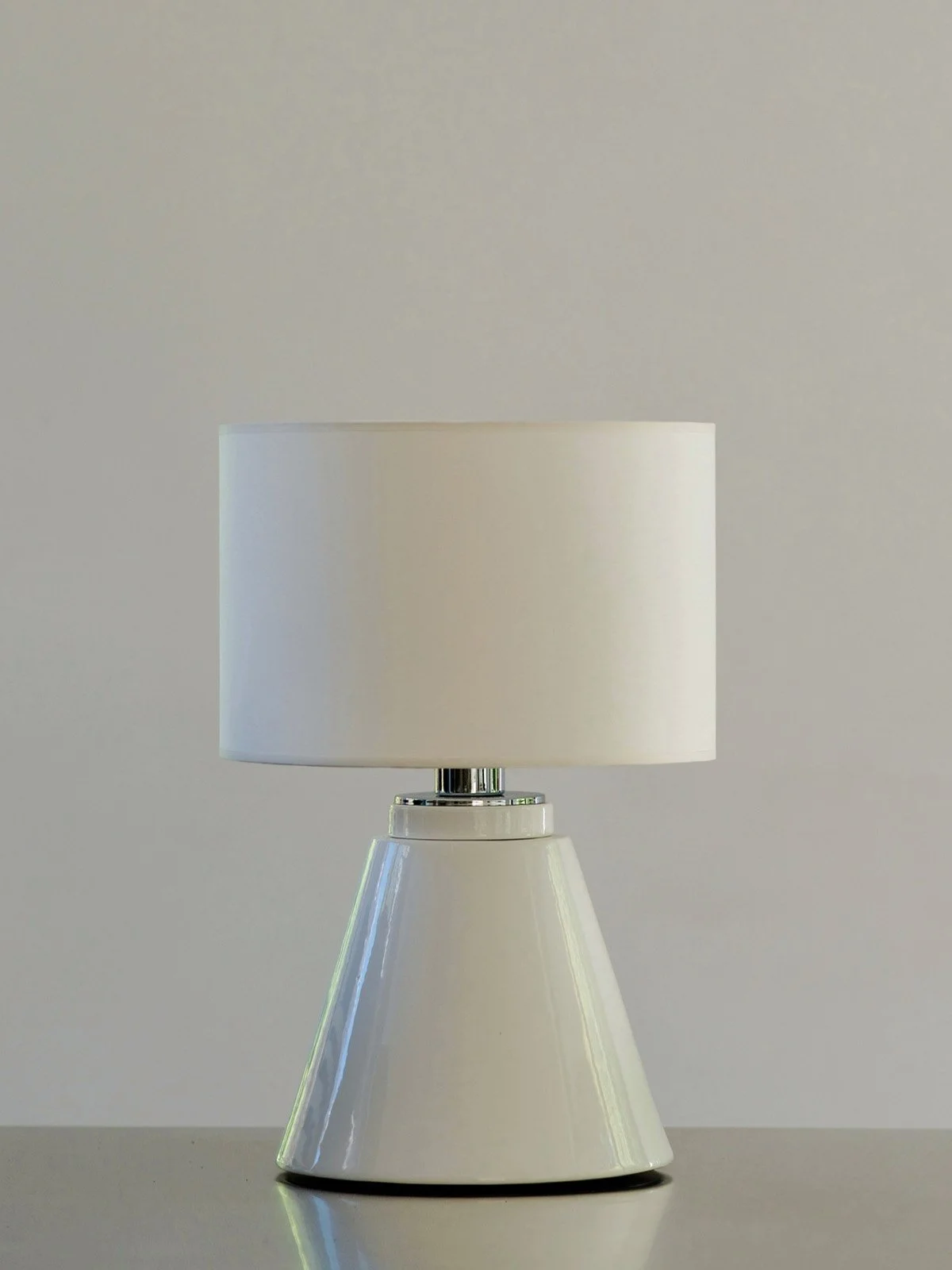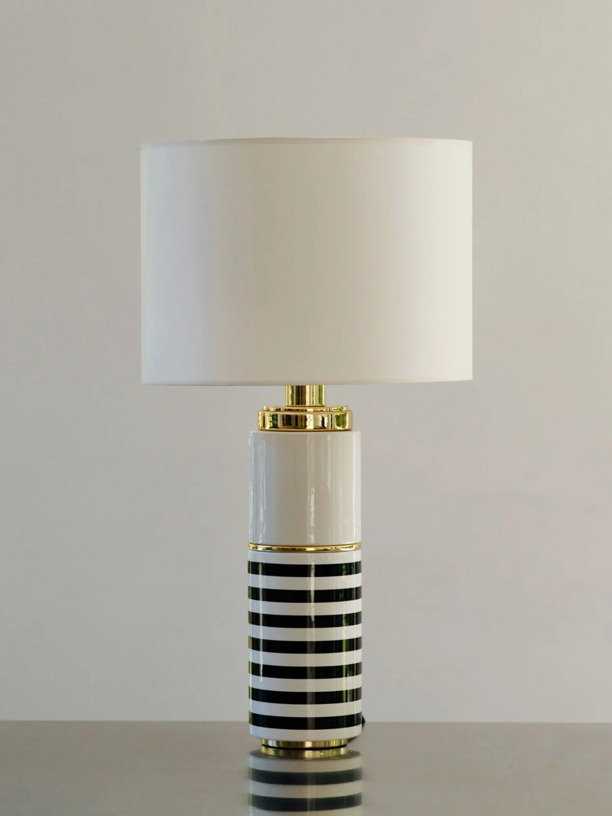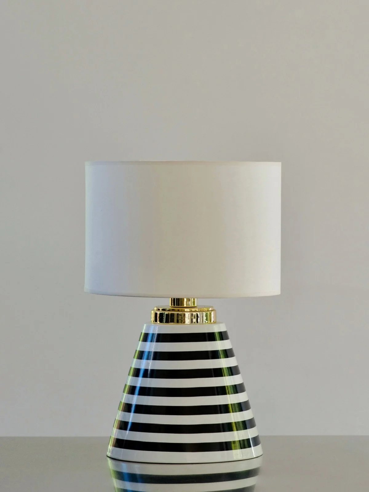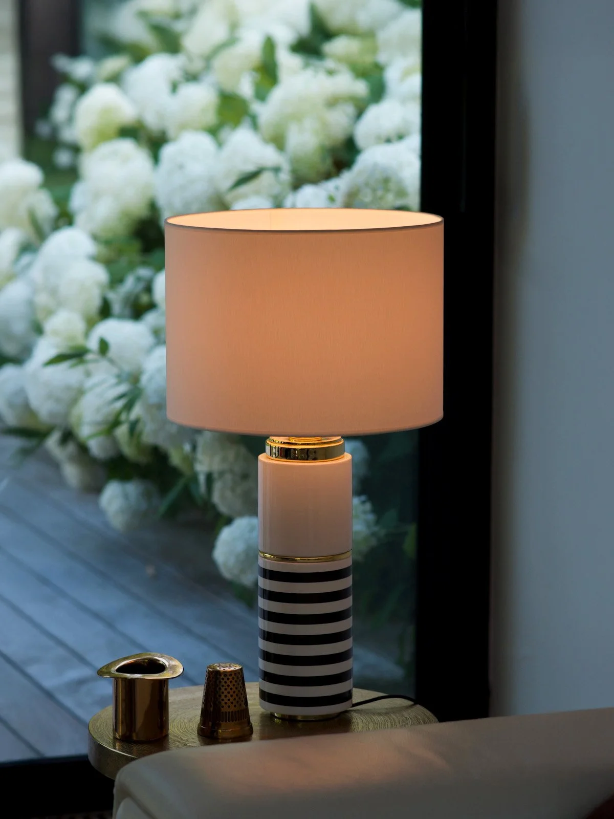 Les éléments en céramique sont assemblés par emboîtement, puis maintenus avec précision à l’aide d’un tube filetée traversant la lampe en son centre. Ce mode de construction assure une parfaite stabilité et met en valeur l’aspect modulaire de la pièce.Le haut du pied est rehaussé d’un col et d’un cache-douille en métal doré, qui diffusent une lumière chaude et raffinée une fois la lampe allumée.