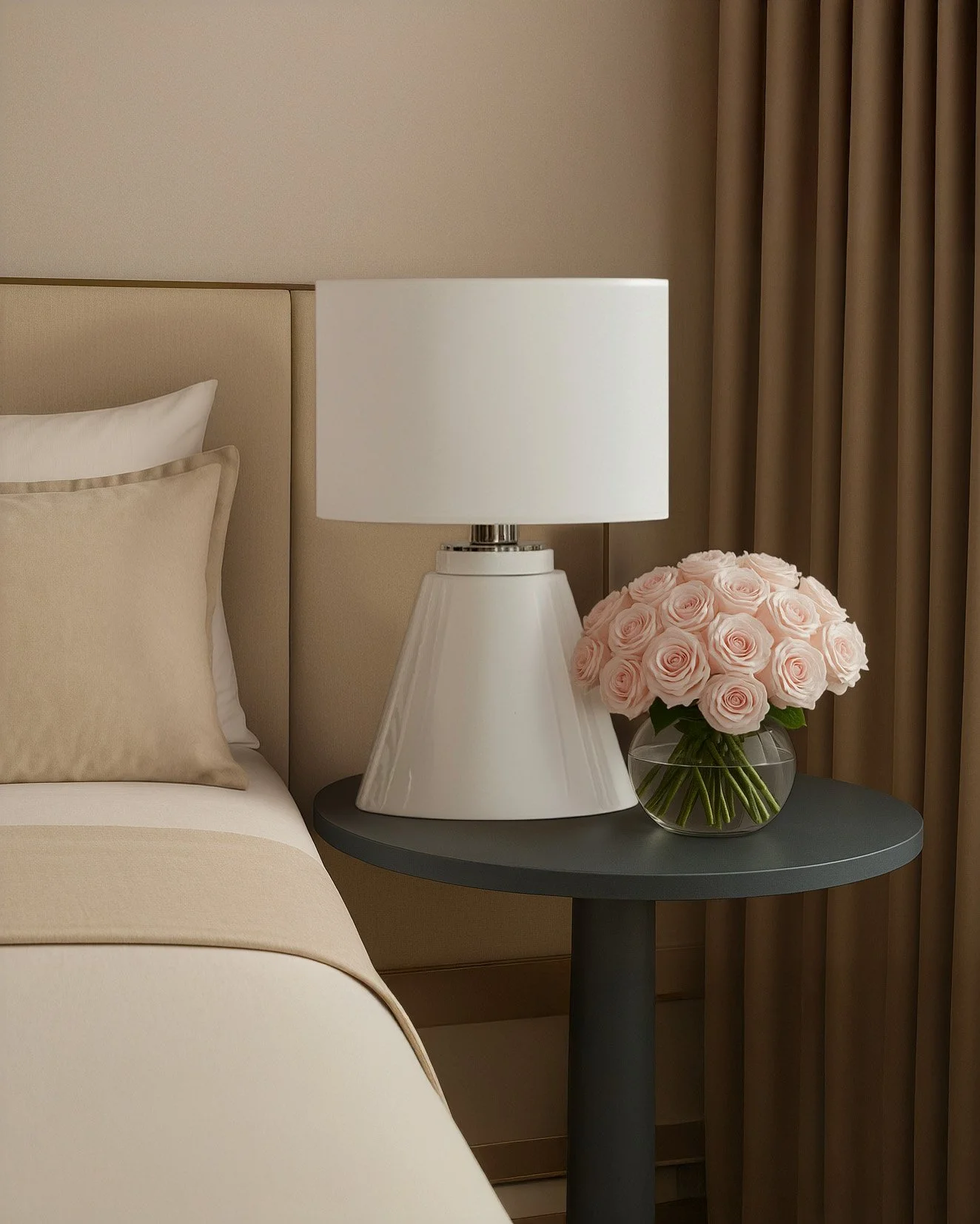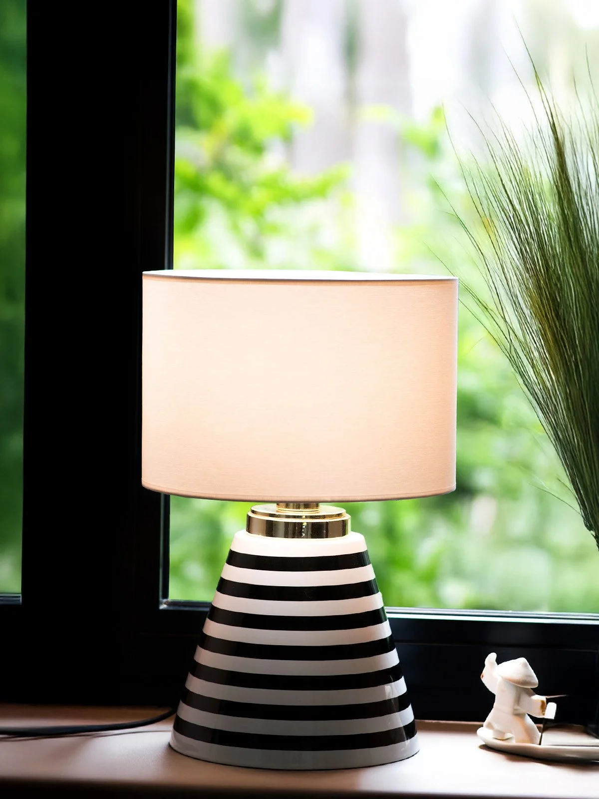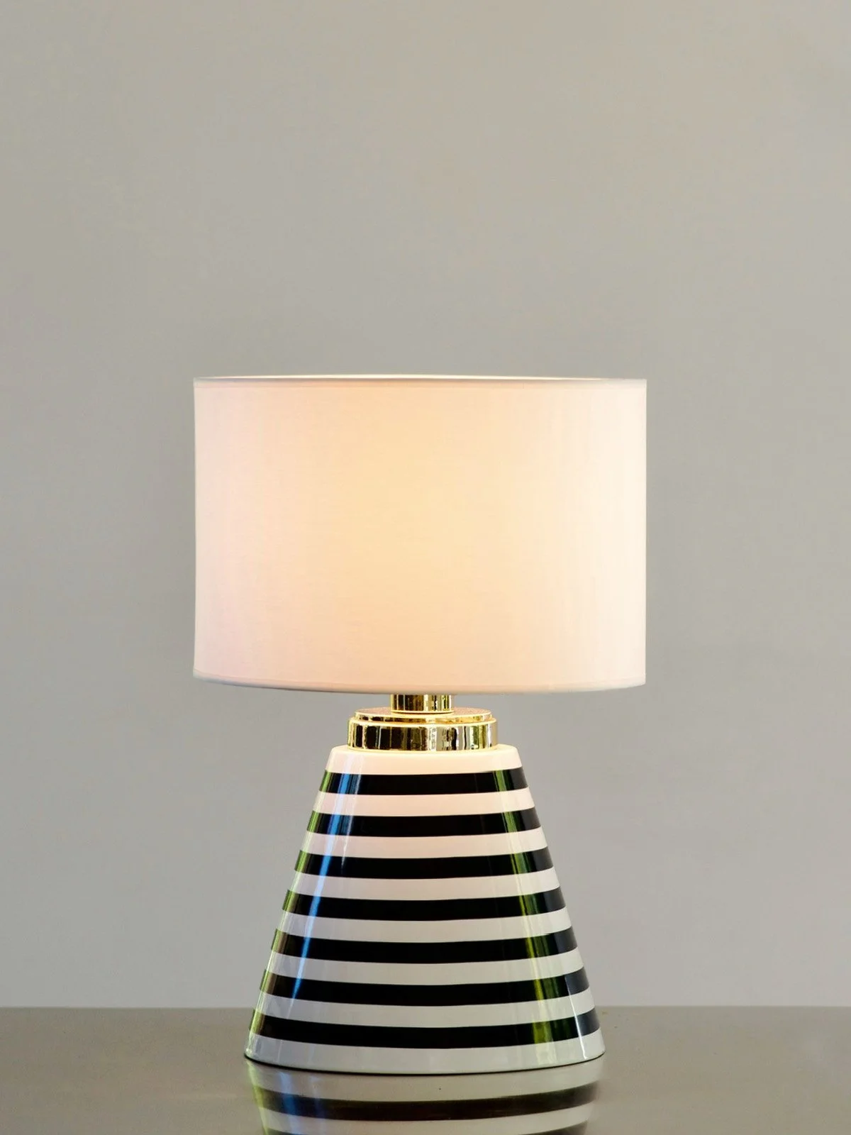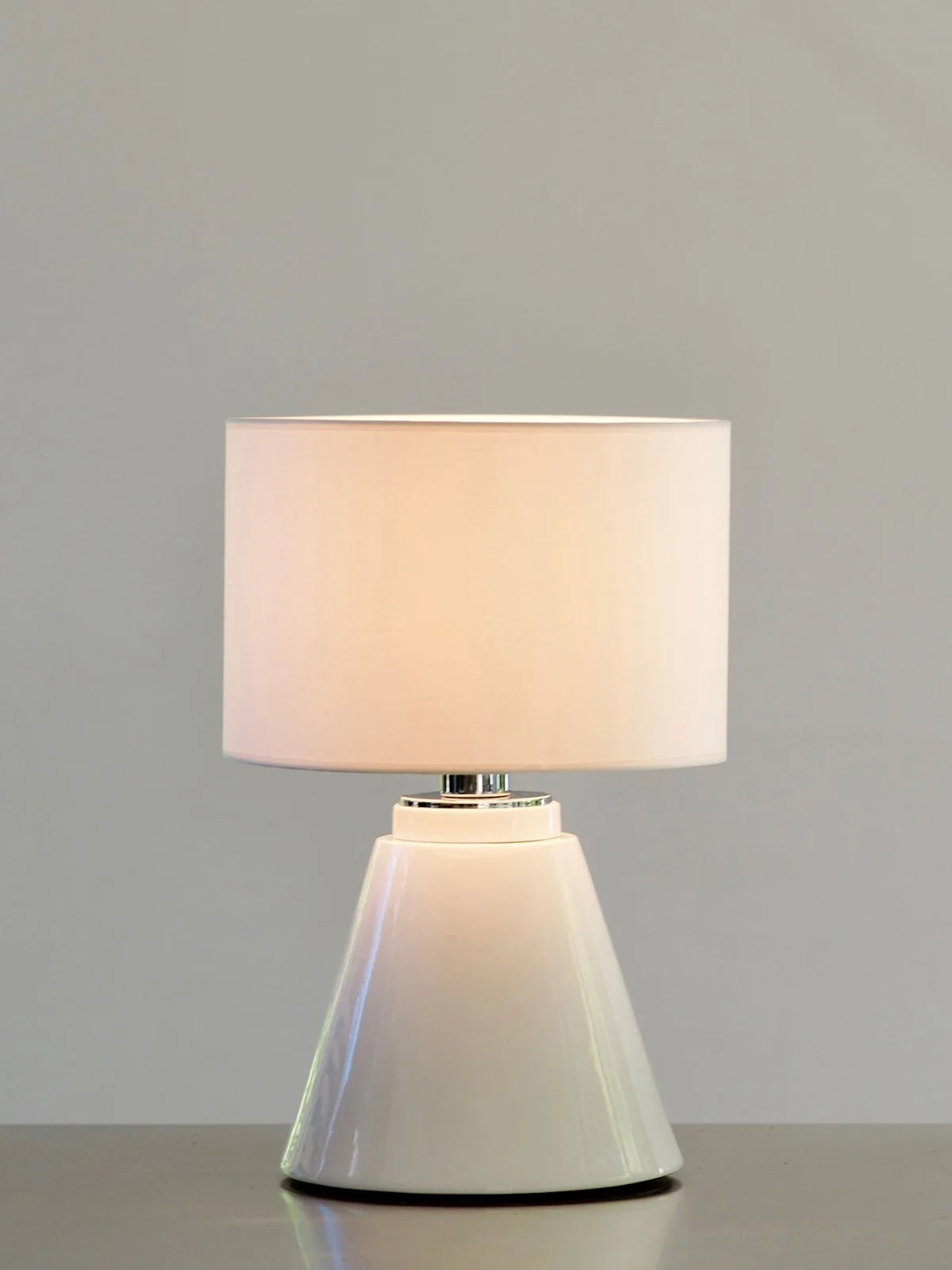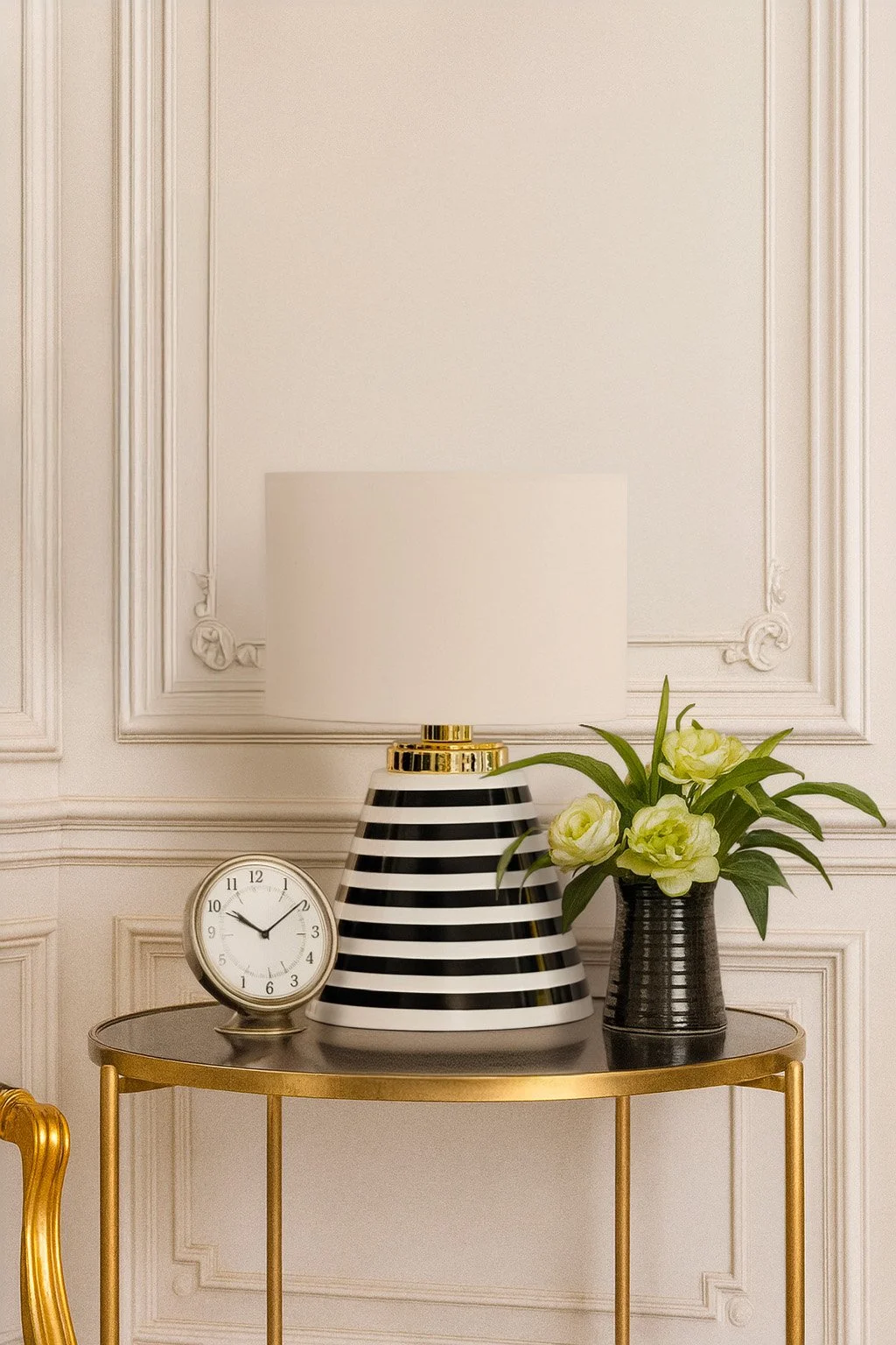 Les éléments en céramique sont assemblés par emboîtement, puis maintenus avec précision à l’aide d’un tube filetée traversant la lampe en son centre. Ce mode de construction assure une parfaite stabilité et met en valeur l’aspect modulaire de la pièce.Le haut du pied est rehaussé d’un col et d’un cache-douille en métal doré, qui diffusent une lumière chaude et raffinée une fois la lampe allumée.