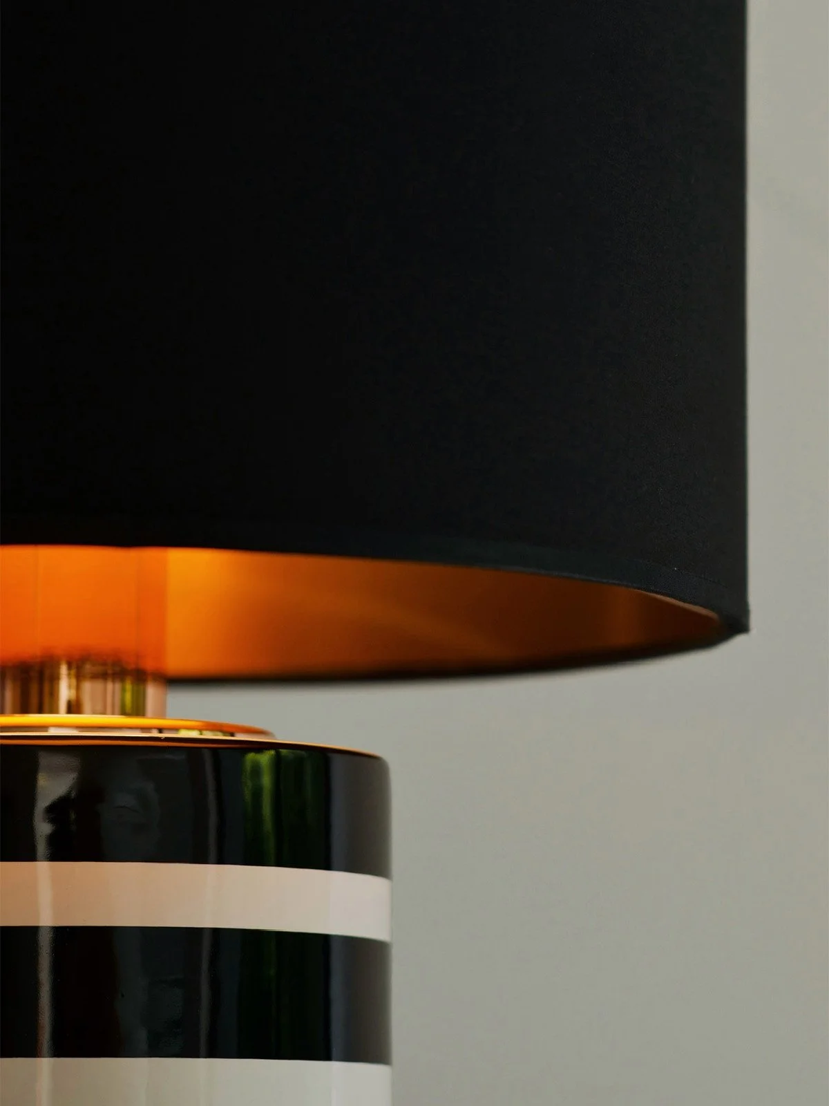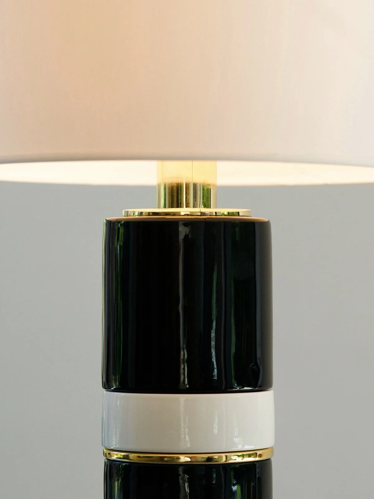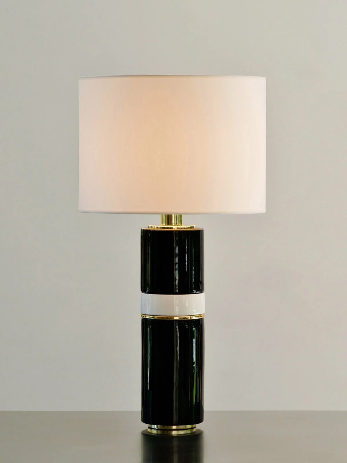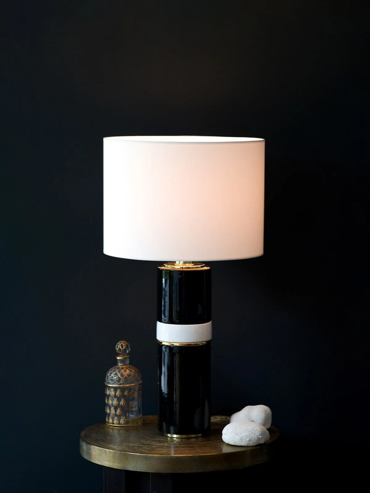 Les éléments en céramique sont assemblés par emboîtement, puis maintenus avec précision à l’aide d’un tube filetée traversant la lampe en son centre. Ce mode de construction assure une parfaite stabilité et met en valeur l’aspect modulaire de la pièce.Le haut du pied est rehaussé d’un col et d’un cache-douille en métal cuivré, qui diffusent une lumière chaude et raffinée une fois la lampe allumée.